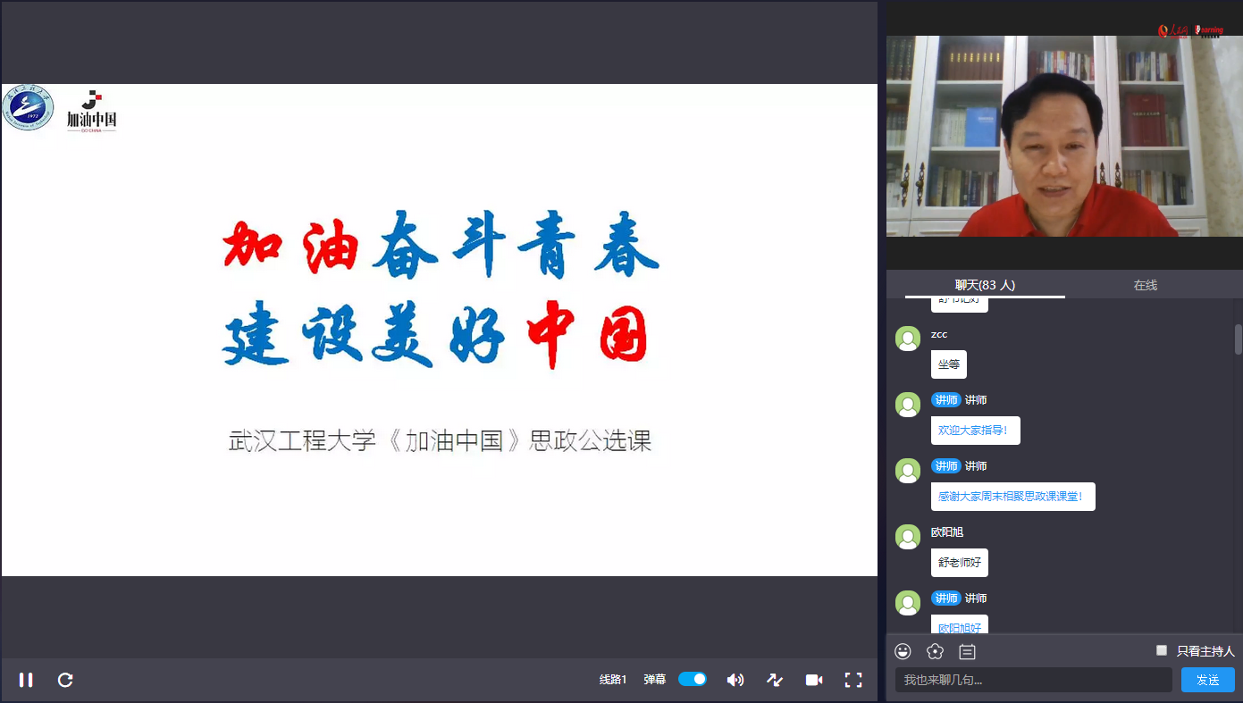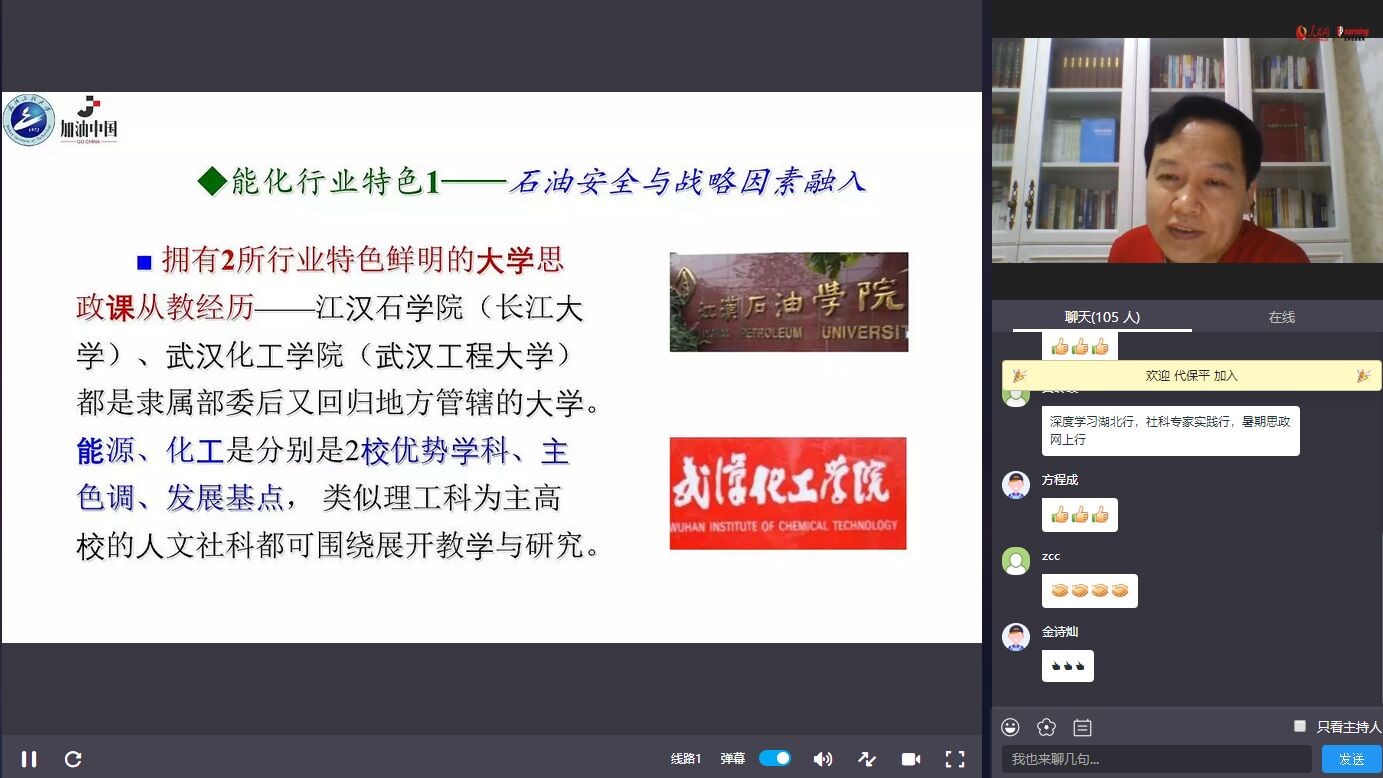 (通讯员 龙晓华)2020年7月4日晚,由8827太阳集团官网主办 ,人民网公开课协办,华中科技大学8827太阳集团官网、湖北经济学院8827太阳集团官网、武汉工程大学8827太阳集团官网、湖北科技学院8827太阳集团官网、黄岭峻工作室及文华在线教育六家单位承办的湖北省第二届“新时代高校思政金课建设”研讨与交流周系列活动之湖北高校“中国系列”思政选修课第四次专题讲座以人民网公开课的方式成功举办。本次讲座的主讲人为武汉工程大学8827太阳集团官网党委书记、国家精品视频公开课《谁来给中国“加油”——中国石油安全的困境与出路》主讲人、“加油中国”课程负责人舒先林教授,讲座主题为“如何将行业特色融入思政课?——以武汉工程大学‘加油中国’为例”。