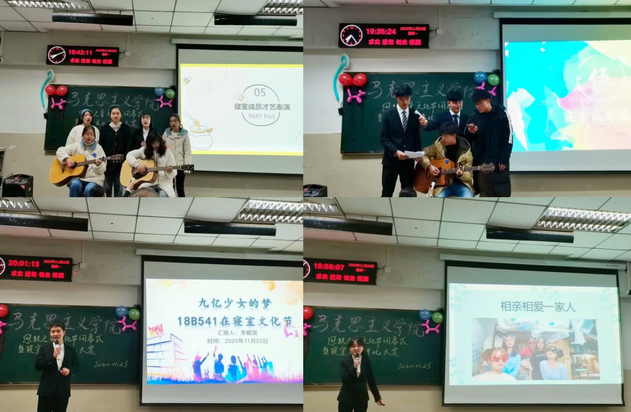 在经过了宿舍卫生安全检查、宿舍文化装饰评比两个环节的综合比拼后,共有十个寝室进入文化评比大赛的最后一个环节——寝室风采展示。在当天的决赛现场,每个寝室选派一名代表通过PPT及视频,进行现场展示答辩。独特个性的趣味寝室名、诙谐幽默的寝室成员介绍、具有不同年级烙印的日常生活学习、各具特色的寝室文化主题,寝室防疫情况,是各个寝室介绍的必备项目。全体寝室成员的视频及现场才艺展示,让现场观众热情高涨,掌声不断,现场气氛活跃,在开怀大笑中领略了风采,增强了抗疫的意识和信心。