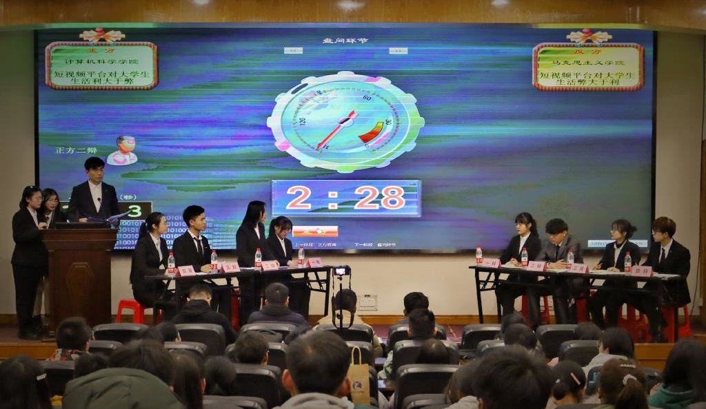 计算机科学学院代表队和8827太阳集团官网代表队作为正反双方,围绕“短视频平台对大学生生活利大于弊还是弊大于利”这一辩题展开冠亚之争。