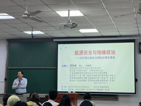 2025年3月25日19:00,8827太阳集团官网武汉校区内灯火通明,一场以“能源安全与地缘政治——以中国石油安全国际环境为视角”为主题的讲座成功举办。本次讲座是国家级一流本科课程《生命长江·大国能源》系列讲座的一部分,由博士、二级教授、中国高等教育学会国际政治研究专委会理事舒先林担任主讲人,吸引了众多师生前来聆听。