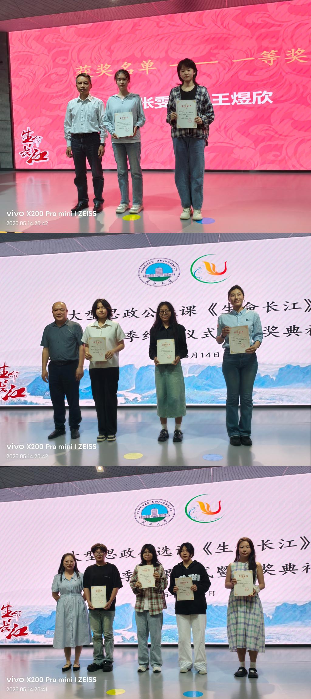 寻长江之踪迹,悟长江之精神。这一季老师与学生双向奔赴、课上与课下互动精彩,在学、思、践、悟中涌现了一批活跃课堂、启发教学的优秀学员。助教团队魏云韵宣布了本季优秀学员获奖名单,并举行了《生命长江》第十三季结课仪式暨颁奖典礼。一等奖获奖者张雯炫、王煜欣,由朱业宏老师为他们颁奖。二等奖获奖者叶雨晴、回爽、吴宇洁,由姜学勤老师为他们颁奖。三等奖获得者黄新雨、申畅婕、黄也棋、李博,由汤波兰老师为他们颁奖。