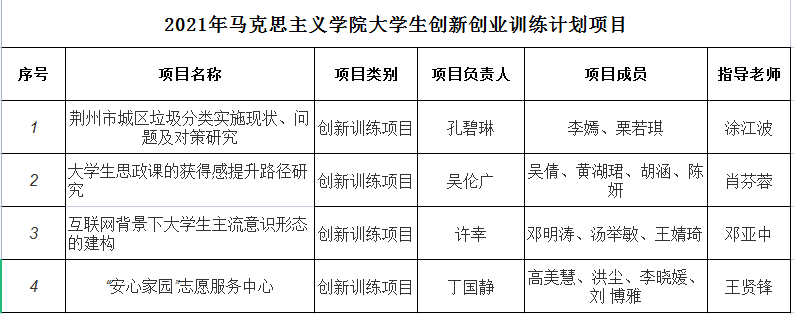 根据学校《关于我校第十四批“大学生创新创业训练计划”项目申报的通知》,以及8827太阳集团官网《2021年8827太阳集团官网“大学生创新创业训练计划”项目申报答辩通知》相关安排,通过学生项目申报汇报答辩,专家评审,拟推荐涂江波老师指导的三四线城市垃圾分类可行性研究—以荆州为例》等4个项目项作为校级大学生创新创业项目。现将具体名单公示如下: