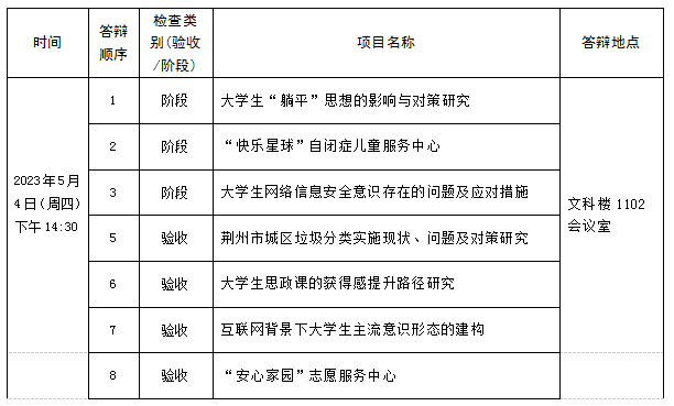 根据学校《关于2023年大学生创新创业训练计划项目结题验收、阶段检查工作的通知》要求,结合太阳官网实际情况,现将太阳官网2023年大学生创新创业项目阶段检查及结题验收现场答辩安排如下: