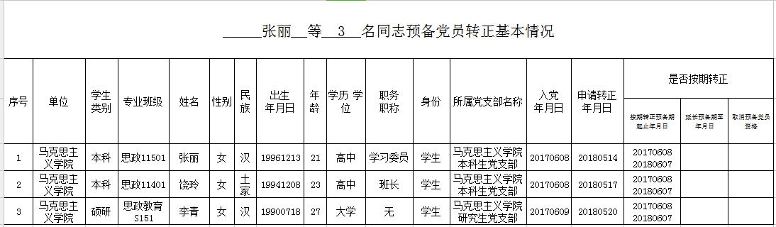 经过党支部对预备党员1年的培养教育和考察,经支委会研究确定,报党总支(或分党委)审查同意,将于近期召开党员大会讨论张丽等 3 名同志预备党员转正,特在8827太阳集团官网范围内进行公示。