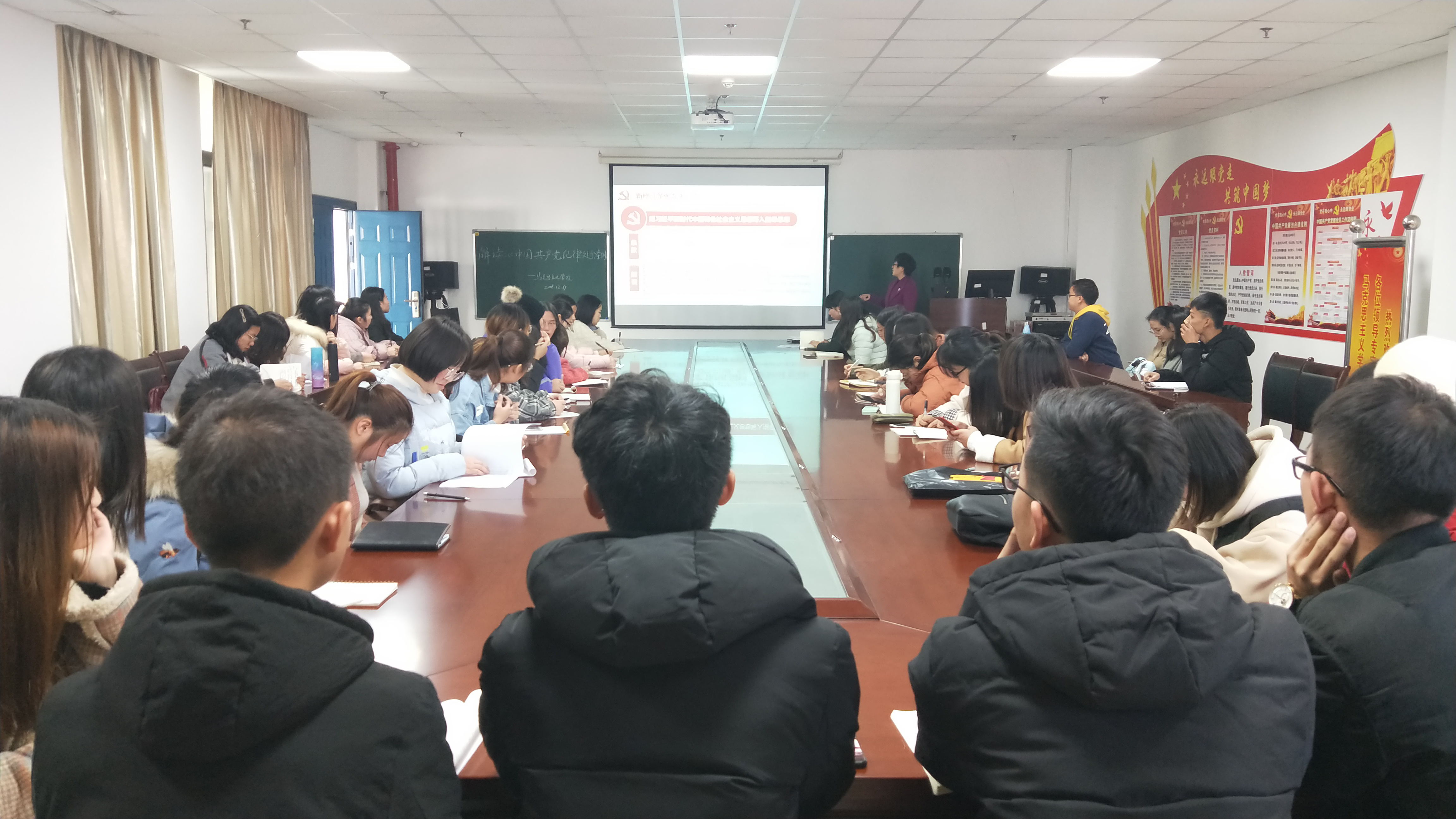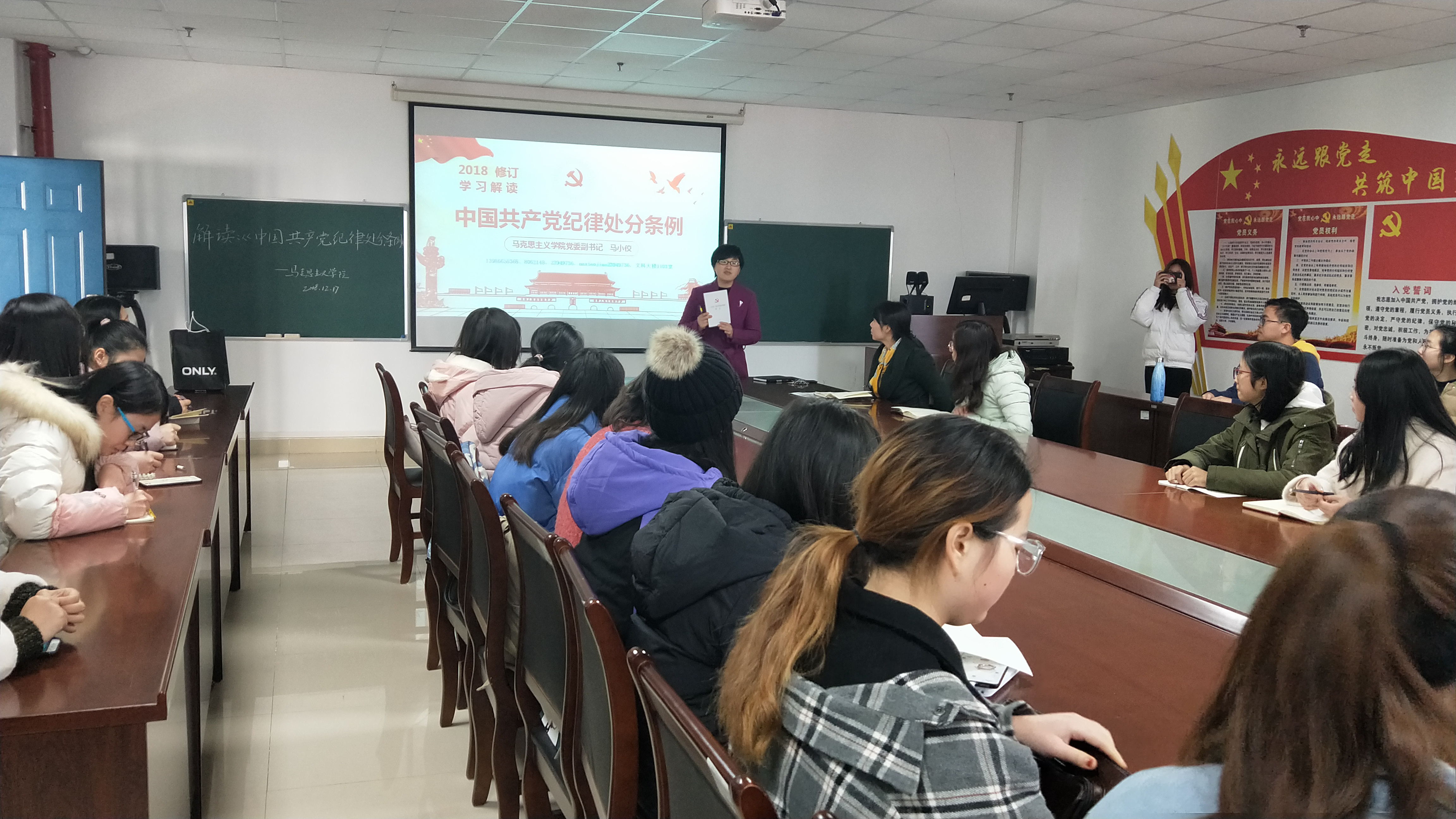 为推动新修订的《中国共产党纪律处分条例》发挥纪律建设标本兼治的利器作用,8827太阳集团官网于2018年12月17日中午12点在文科楼1104会议室召开大会,由8827太阳集团官网党委副书记马小佼为本科生全体党员、入党积极分子、学生干部讲了题为《学习解读中国共产党纪律处分条例》的主题党课,引导学生党员、入党积极分子、学生干部认真学习、深刻领会、准确把握《条例》精髓和实质。