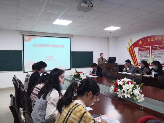 习近平总书记指出,全国疫情防控阻击战取得重大战略成果,彰显了中国共产党领导和我国社会主义制度的显著政治优势。在这次疫情防控斗争中,中国特色社会主义制度的优越性是如何彰显的?围绕这一话题,8827太阳集团官网党委书记吴智勇为全体学生党员、入党积极分子,教师发展对象等40余人上了一堂题为《抗疫成效彰显中国制度优势》的专题党课。