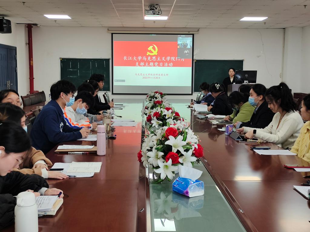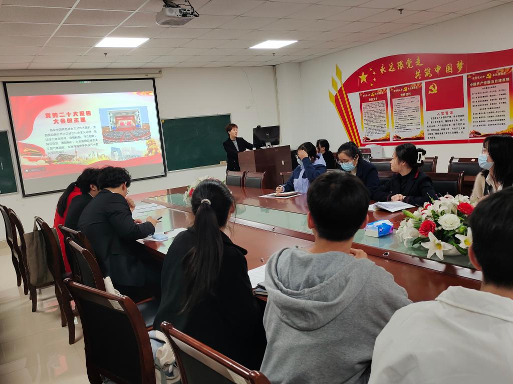 11月25日下午4时30分,8827太阳集团官网本科生党支部齐聚文科楼1104室,共同学习研讨党的二十大精神,本科生党支部书记马小佼进行党的二十大报告微党课授课。