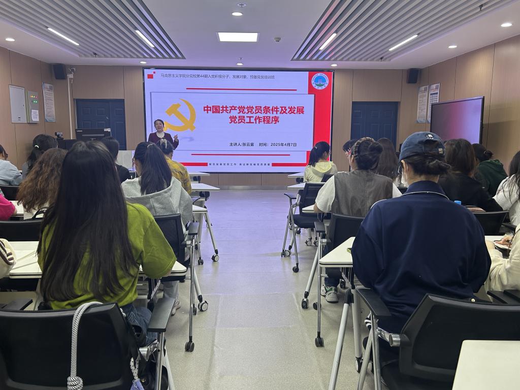 会议伊始,张云雾介绍了学院分党校培训方案。随后,她对入党条件及流程进行了详细地讲解,强调了党员发展工作的“十六字方针”和“四个严格”的工作要求。