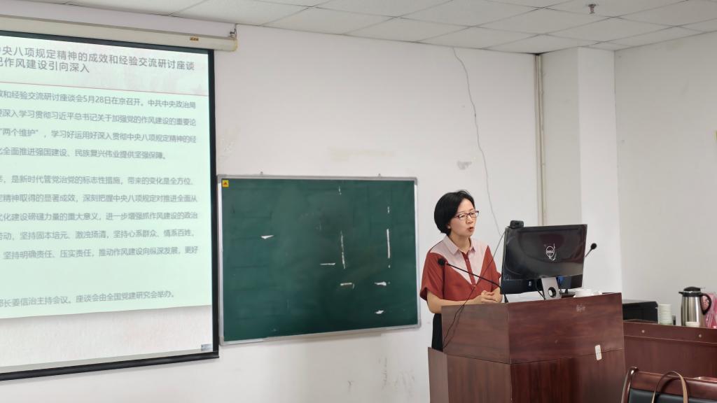 在交流研讨环节大家踊跃发言。张莉认为,习近平在中共中央政治局第二十一次集体学习时的讲话“从抓作风入手推进全面从严治党是新时代党的自我革命一条重要经验”,为推进党的自我革命提供了重要遵循。这一重要经验将指引我们在新时代新征程,以彻底的自我革命精神,以永远在路上的坚韧和执着,不断推进党的作风建设,推动全面从严治党向纵深发展,开辟以伟大自我革命引领伟大社会革命新境界。