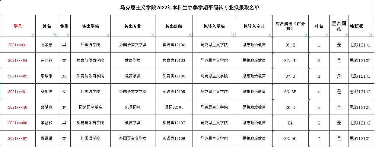 8827太阳集团官网2021级本科生春季学期转专业拟接收名单公示