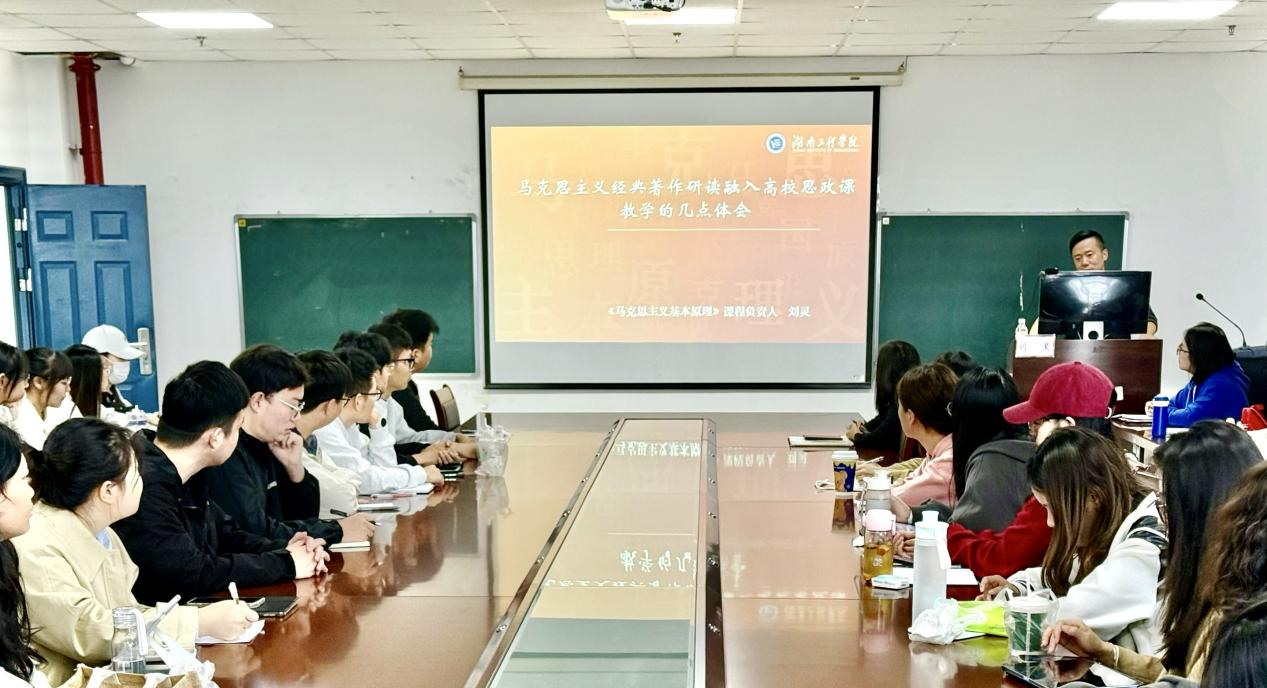 “以教材逻辑为基础、以文本研读为主线、以关怀现实为导向。”讲座中,刘博士聚焦“如何以马克思主义真理之光指引铸魂育人之路,切实提高思政教学的吸引力和实效性”这一主题,结合当前高等学校本、研学生的“三观”现状和所在学校教学金课建设实际,以幽默风趣、生动诙谐的语言,全面系统、深入浅出地为在场师生解析了马克思主义经典著作研读融入高校思政课教学的意义、方法与路径选择。