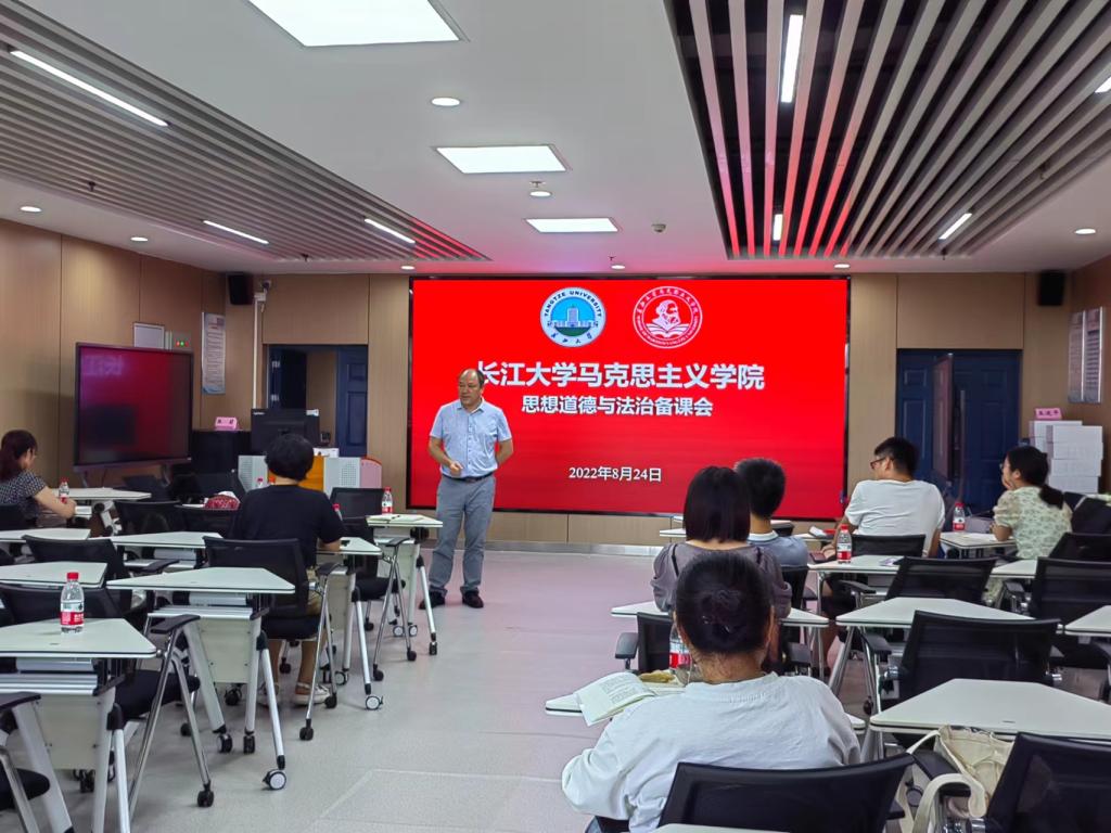 2022年8月24日下午,8827太阳集团官网《思想道德与法治》课程组在文科楼1008室开展集体备课会。会议由课程组组长肖芬蓉主持,课程组全体教师参会。本次会议有三个主要议程:一是开展新入职教师教学展示活动;二是新学期教学安排;三是开展专题理论学习。
