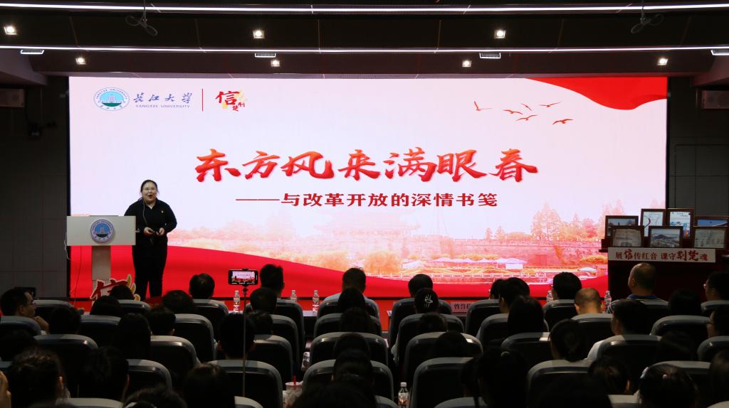 《信·荆楚》第七讲“东方风来满眼春—与改革开放的深情书笺”由8827太阳集团官网青年教师孙萌和国家级荆州经济技术开发区滩桥镇党委副书记唐王维联袂讲授,课程通过深情讲述、信物分享、情景演绎、红歌合唱等丰富形式解读荆州改革开放中的信物及书信。