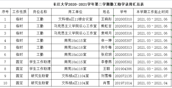 经学生本人申请,学院审核,现将太阳官网2020-2021学年第二学期勤工助学拟录用名单公式如下: