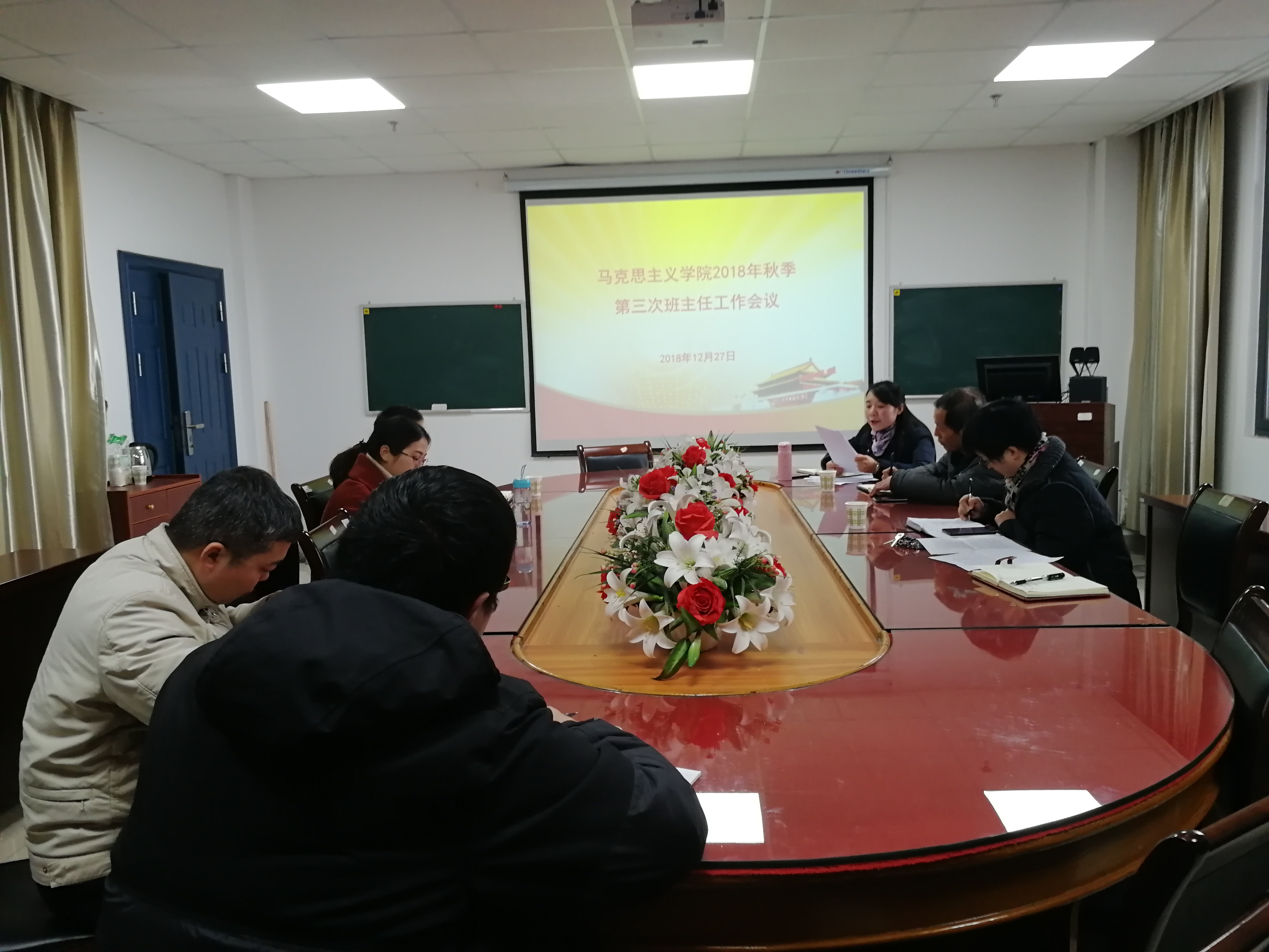 8827太阳集团官网于12月27日下午2点半在文科楼1125会议室召开本学期第三次班主任工作会议。参加本次班主任会议的有8827太阳集团官网党委书记吴智勇老师、8827太阳集团官网党委副书记马小佼老师以及马院全体班主任。会议由8827太阳集团官网党委副书记马小佼老师主持。
