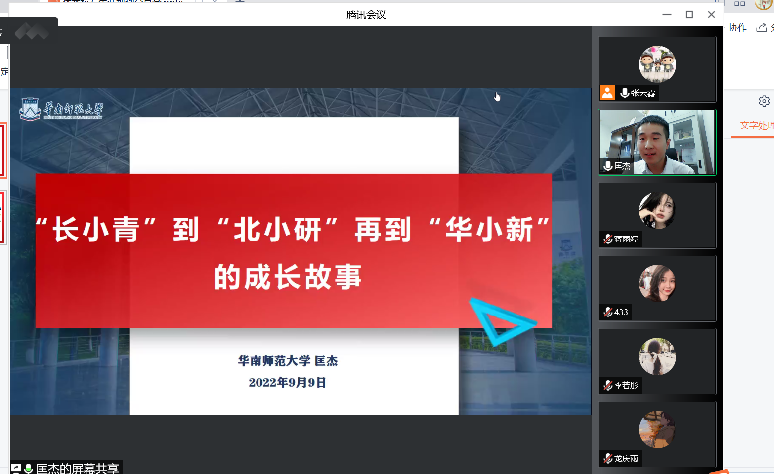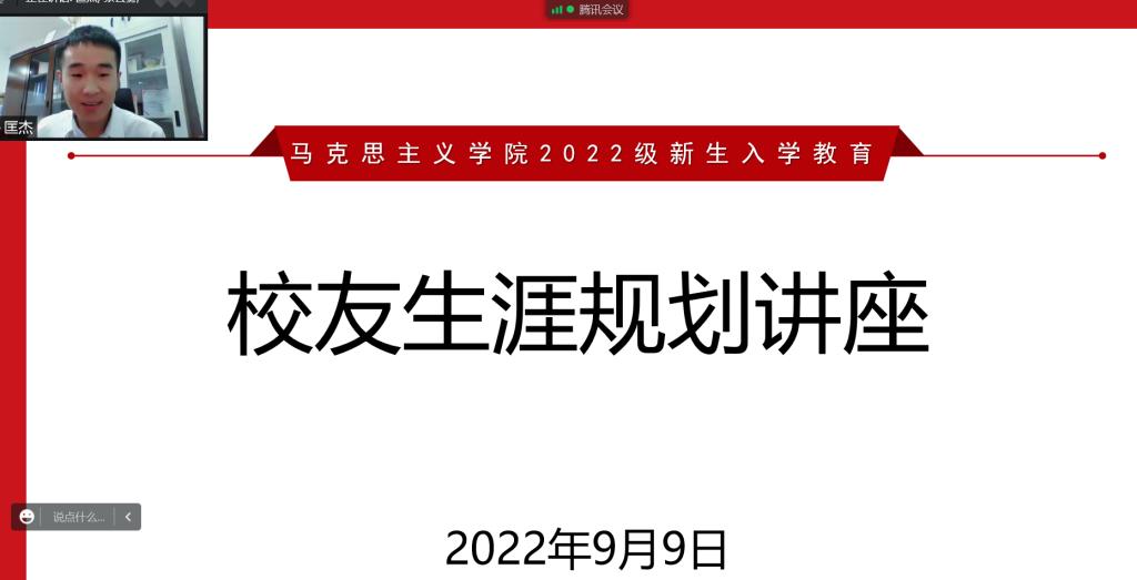 9月9日晚,学院邀请了优秀校友匡杰老师为新生做生涯规划指导。匡杰为太阳官网2017届本科毕业生,2017年至2019年就读于北京师范大学,现为华南师范大学信息光电子科技学院的辅导员。在一个半小时的交流中,匡老师分享了他从“长小青”到“北小研”再到“华小新”的成长故事。他以自身经历勉励新生要善于认识自我,及早定立目标,持之以恒努力,以更加昂扬的姿态融入大学生活,全力以赴向着自己的目标前进。听了他的分享后,新生还意犹未尽,纷纷在线提问,探寻学长成功的秘诀。