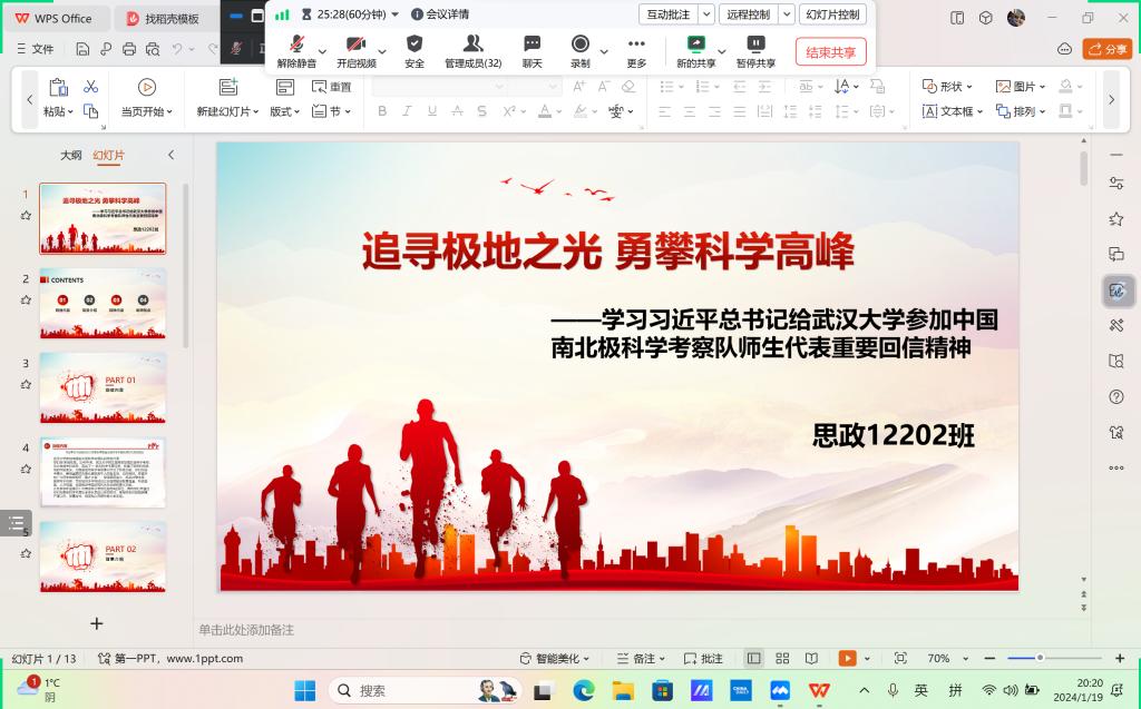 各班级以线上方式召开主题班会,同学们原原本本地学习了回信内容,并围绕回信精神展开学习交流,分享心得体会。大家纷纷表示,习近平总书记给武汉大学参加中国南北极科学考察队师生代表的回信饱含深情,催人奋进。作为思政学子,要以回信精神为指引,志存高远、脚踏实地,用知识和汗水浇灌青春梦想,以实际行动为强国建设、民族复兴贡献新的更大力量。