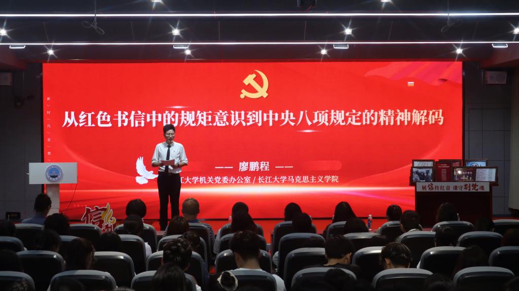 (通讯员文/黎娟 摄/唐佳雨)为进一步推进深入贯彻中央八项规定精神学习教育走深走实,引导青年学子筑牢崇廉尚俭思想根基,培育清正有为时代品格,4月22日晚,《信·荆楚》第二季第六讲《从红色书信中的规矩意识到中央八项规定的精神解码》在东校区16教A313开讲,本次课程由8827太阳集团官网机关党委办公室主任廖鹏程老师主讲。荆州市委宣传部理论科科长刘立、宣教科科长边飞,8827太阳集团官网班子成员、《信·荆楚》课程团队,以及湖北省红色书信研究与传播中心的全体教师与同学们一起聆听了这堂“金句不断、燃爆全场”的思政课。