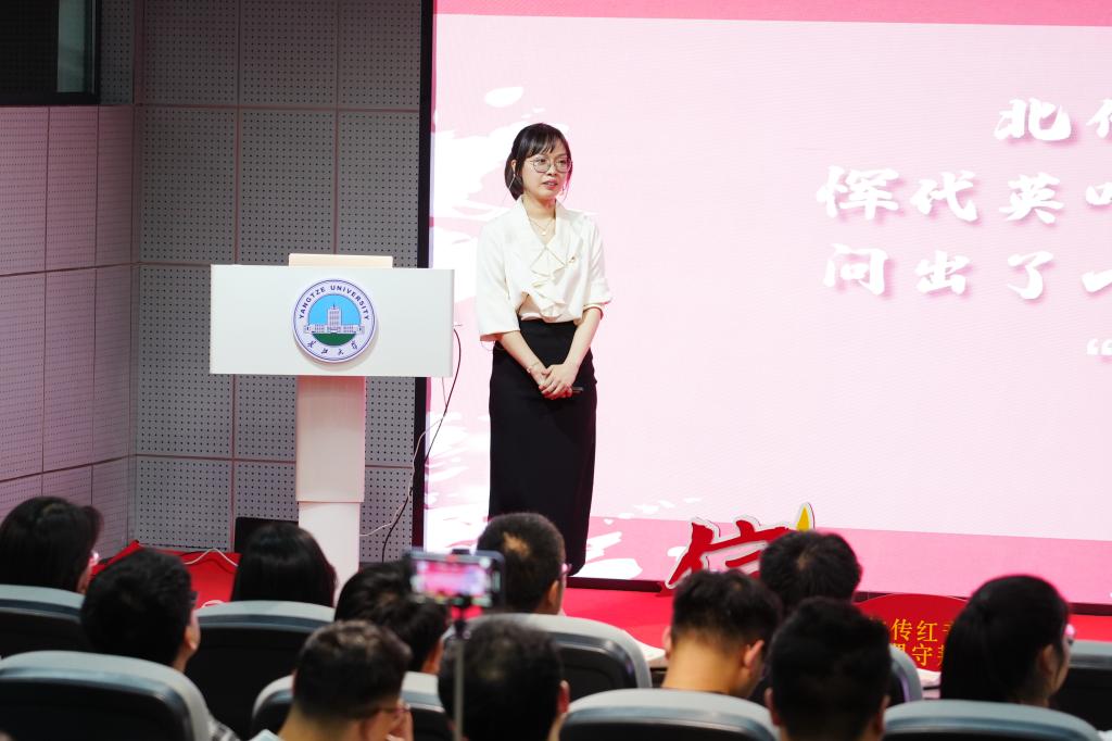 “面对自由和信仰,“他”如何抉择呢?”王羿茹、杨耀峰、许圣、石家乐同学通过情景短剧《留得豪情作楚囚》,还原了中国共产党早期无产阶级革命家恽代英英勇就义的情景,让现场师生在沉浸式体验中感受到了共产党人“革命理想高于天”的至高情怀。