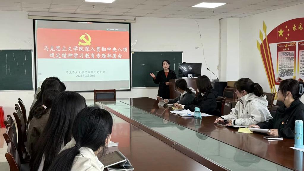 重温入党誓词、交纳本月党费、学习《中国共产党章程》(第四章)后,杨新玉同志领学了习近平总书记关于深入贯彻中央八项规定精神学习教育的重要讲话和重要指示精神,习近平在二十届中央纪委四次全会上的重要讲话精神,以及《求是》杂志发表习近平总书记重要文章《健全全面从严治党体系》;秦雯婧同志领学了2025《政府工作报告》、2025年全国教育工作会议精神、2025年全省教育大会精神以及湖北省“新春第一会”精神等重要会议精神;王诗媛同学领学了中共中央办公厅印发《全国党员教育培训工作规划(2024—2028年)》等内容。党支部书记张云雾传达学习了学校2025年度工作部署会、校纪委二届五次全会等学校相关会议精神,结合支部实际启动部署深入贯彻中央八项规定精神学习教育工作,并以微党课的形式进行了深入贯彻中央八项规定精神学习教育专题辅导。