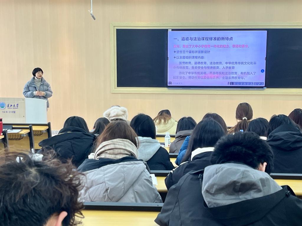 徐骆老师简要介绍了黎老师30余年的教学经历与突出成就,引发同学们热烈期待。黎老师围绕中学思政教育的特点,分析课程标准与教材解读。在课标解读环节,她详细剖析了2022年版道德与法治课程标准的新特点,如落实德育一体化理念、凝练核心素养、实现课程目标综合表达与分学段阐述统一等内容,强调这些变化对中学思政教学的重要指导意义。在教材解读部分,黎老师以初中道德与法治教材为例,深入讲解教材的总体设计、各年级知识脉络以及贯穿其中的社会主义核心价值观教育等要点。为让同学们更好理解,她还结合中考真题,分析知识点在考试中的呈现形式与考查重点,让理论知识与实际应用紧密结合。